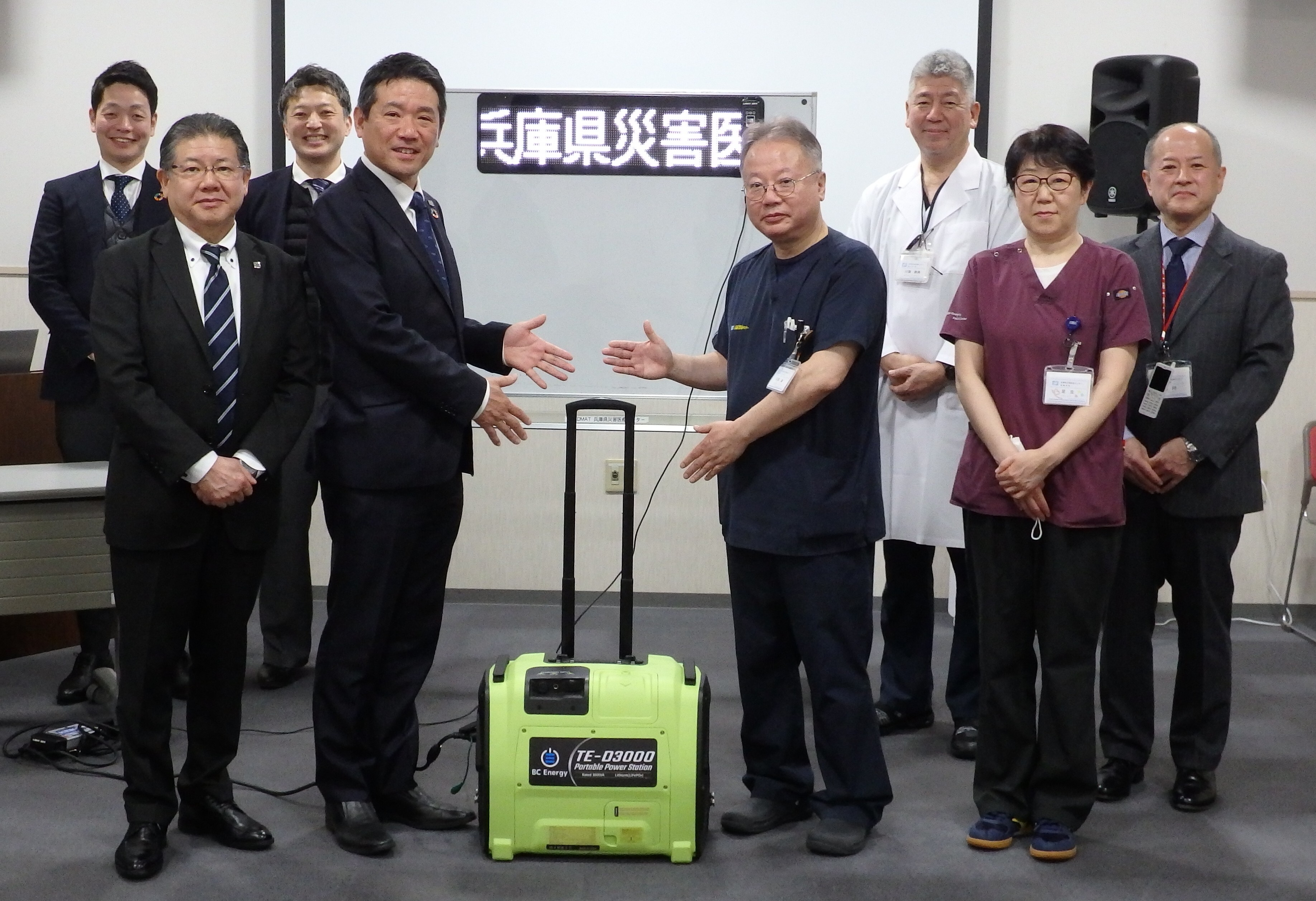 兵庫県災害医療センターは、平時には県下唯一の高度救急救命センターとして生死に関わる重症患者に対する医療を提供する一方、大規模災害時には、基幹災害拠点病院として、被災者の生命を守るために救急医療を行う専門的な医療チームである『DMAT(災害派遣医療チーム)』の被災地への派遣やその隊員の養成研修を担っているということで、災害時の医療活動の継続に貢献したいと考え、BCエナジーの寄贈にいたりました。