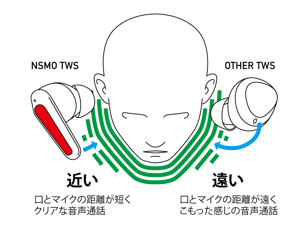 NSMO TWSのマイクは、口の方向(音源)を向くように内側に設計されています。マイクは非常に低い周波数と非常に高い周波数のサウンドを排除し、スムーズでクリアな音声を実現しました。 NSMO TWSは、電話会議やテレビ会議に最適なマイク品質も提供します。これにより話し手と聞き手の両方の声がはっきりと聞こえるようになります。