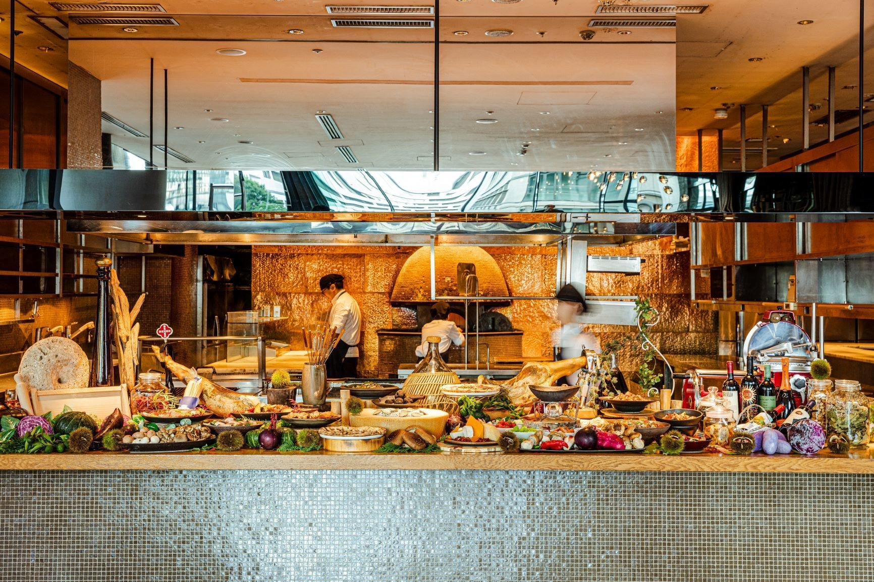 広々とした自慢のオープンキッチンにずらっと並ぶ華やかなブッフェの数々は目でも愉しませてくれます。香りと食感が特徴でシェフのイチオシ「厳選豚と春野菜のフリカッセ」や、大人気のリゾットには「たっぷり春野菜と削りたてグラナパダーノで和えた濃厚リゾット」が登場。