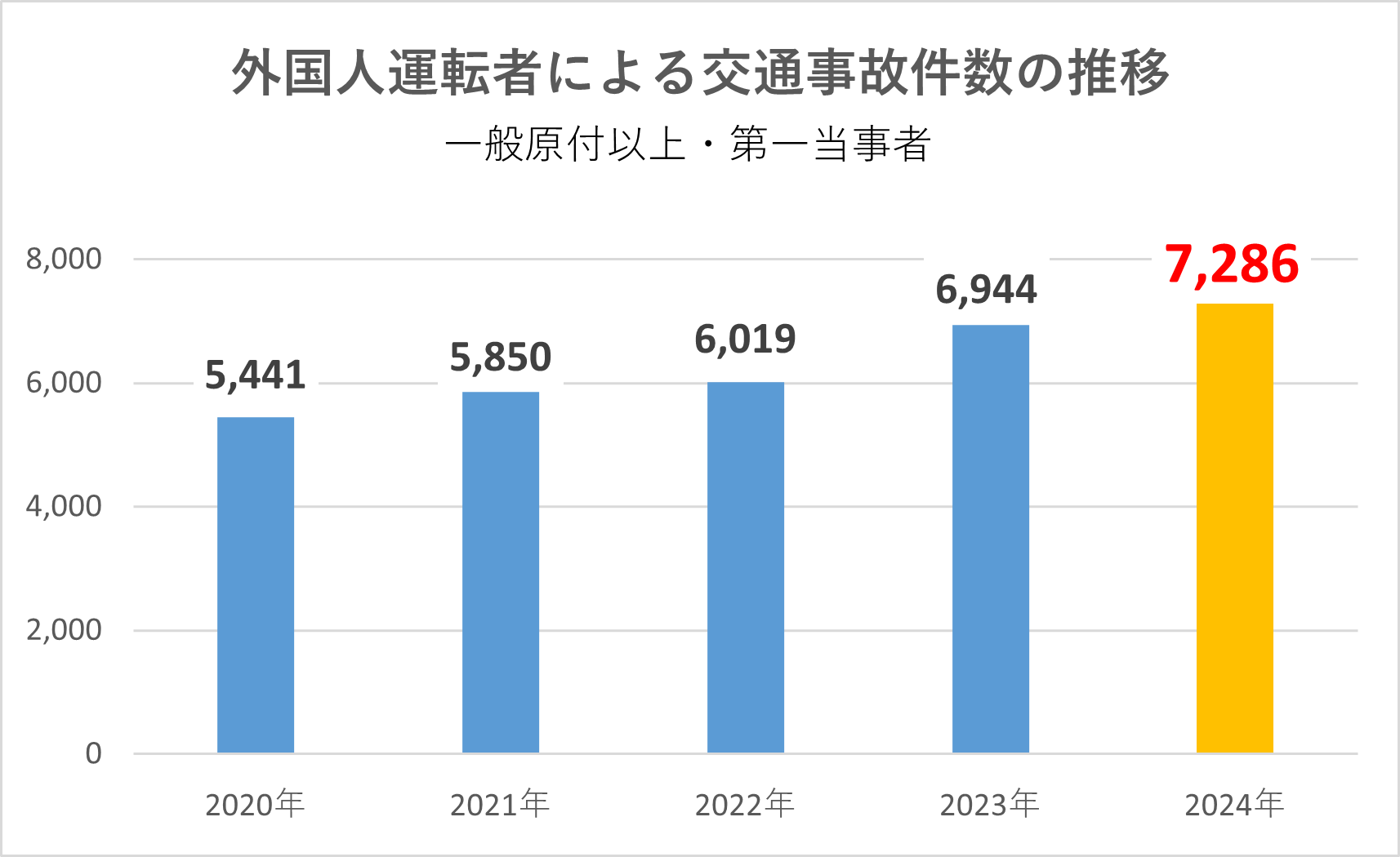 日本の運転免許証を保有する外国人が昨年末時点で過去最多の約125万人となっていることを背景に、事故件数も令和2年の5,441件に対し6年は7,286件と増加傾向にあります。