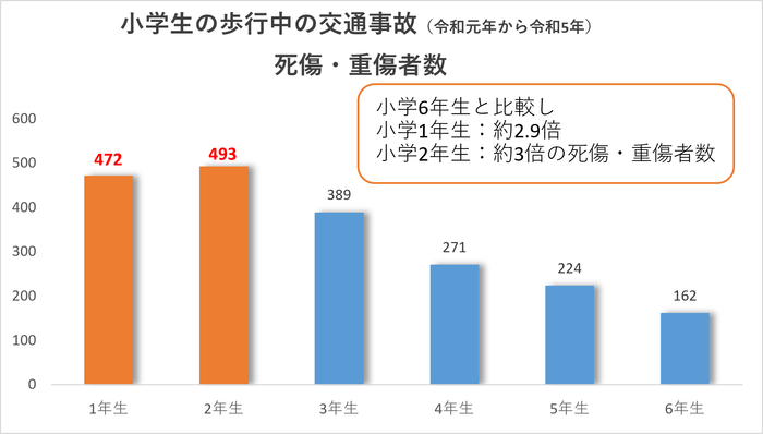 小学6年生と比較すると、小学1年生の歩行中死者・重傷者数は約2.9倍、小学2年生は約3倍と、低学年の子どもが占める割合が高いことが伺えます。