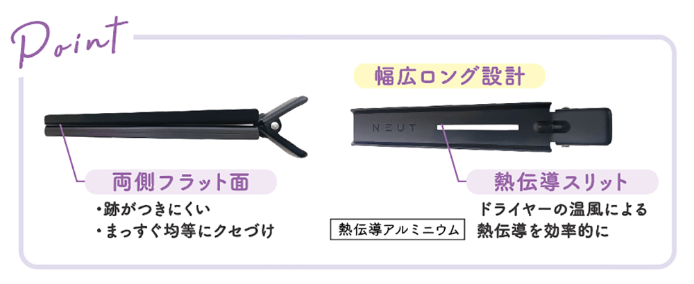 「ニュート前髪立ち上げクリップ」は素材を熱伝導のよいアルミにすることで、ドライヤーの熱を髪に伝えて癖付けしやすくなりました。