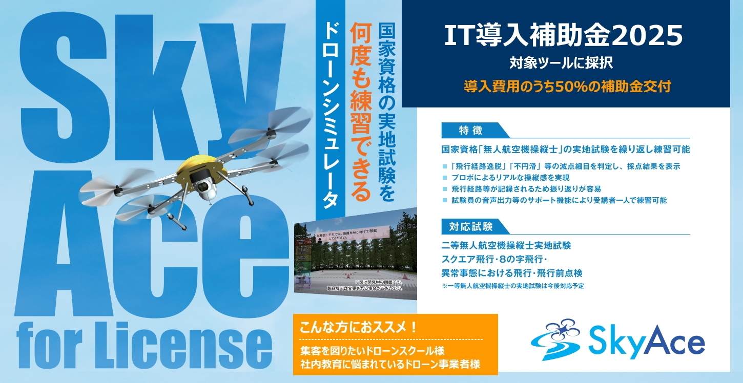 空撮や測量の分野を中心にドローン(UAV)の利活用が進む現在、2022年12月より日本でも無人航空機操縦者技能証明制度が開始されました。「SkyAce for License」は、無人航空機操縦士試験のうち「二等無人航空機操縦士 回転翼航空機(マルチローター)」の実技試験を、一般販売されているプロポ送信機を使用して、場所や天候に影響されず何度でも練習できるシステムです。