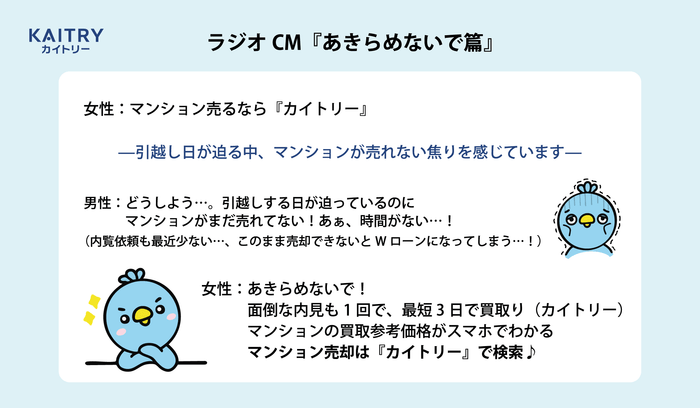 新作ラジオCMは3月10日(月)から3月31日(月)まで、TBSラジオでお聴きいただけます。TBSラジオの幅広いリスナーの皆さまに、当社が提供する不動産AI査定サービス『KAITRY』を知っていただく機会となり、CMを通じてマンションの売却や住み替えについてのお悩みを『KAITRY』で解決できることをお伝えできればと考えています。