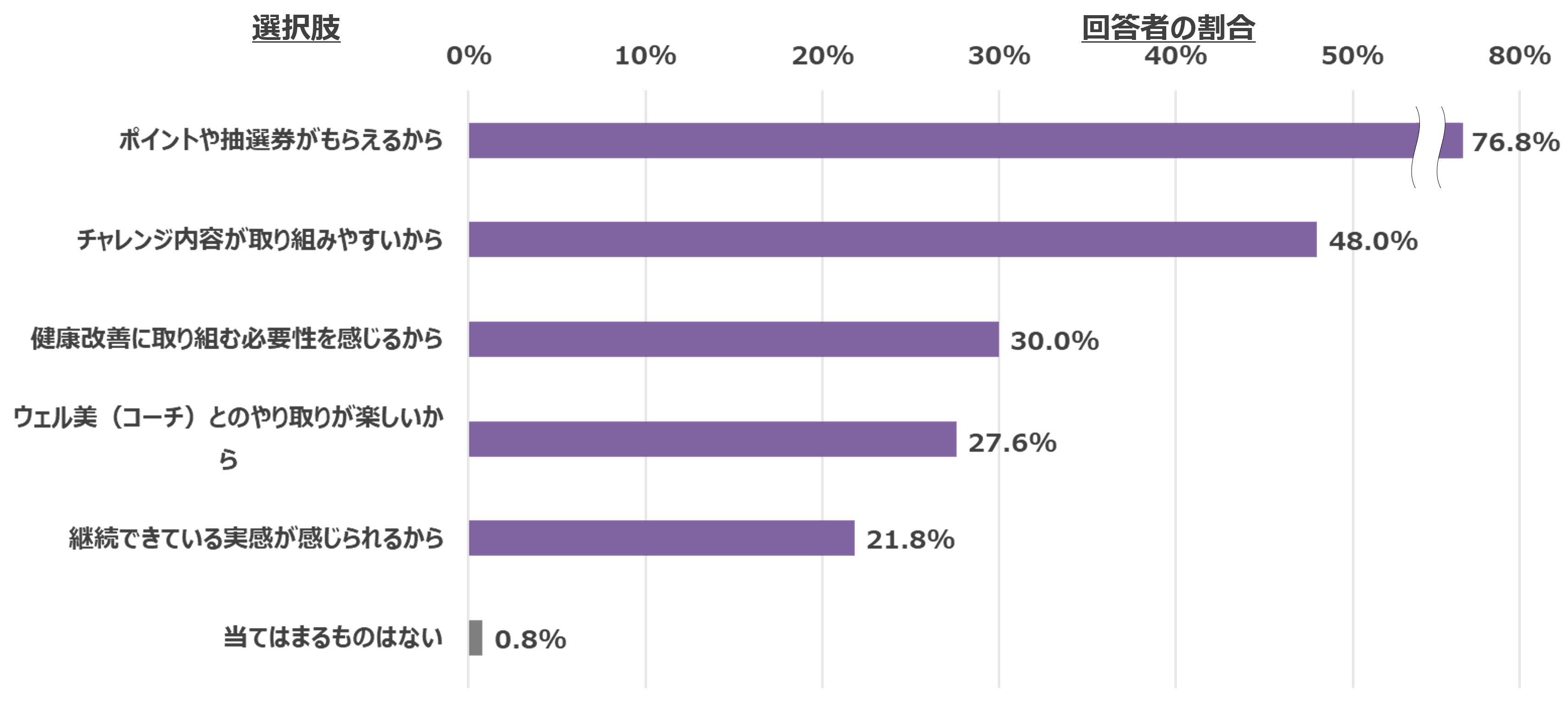 チャレンジ継続している理由として抽選機能に次いで多かった回答は「チャレンジの取組みやすさ」と「健康改善に取り組む必要性を感じていること」でした。
