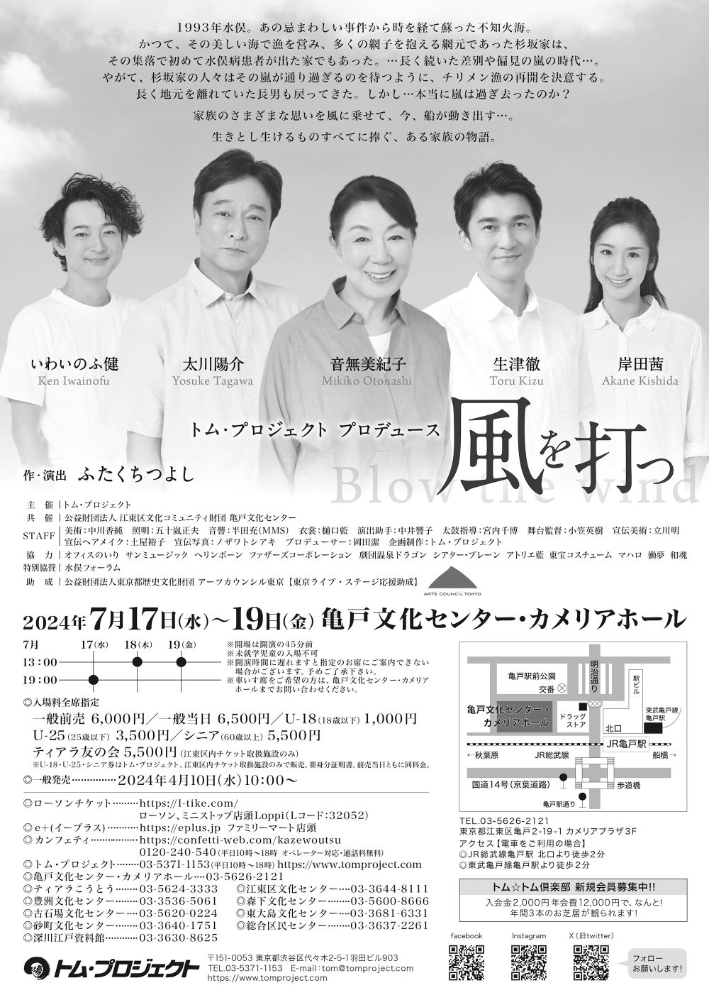トム・プロジェクト(代表:高橋洋介)主催、『風を打つ』が2024年7月17日 (水) ~2024年7月19日 (金)に亀戸文化センター カメリアホール(東京都江東区亀戸2-19-1カメリアプラザ5F)にて上演されます。