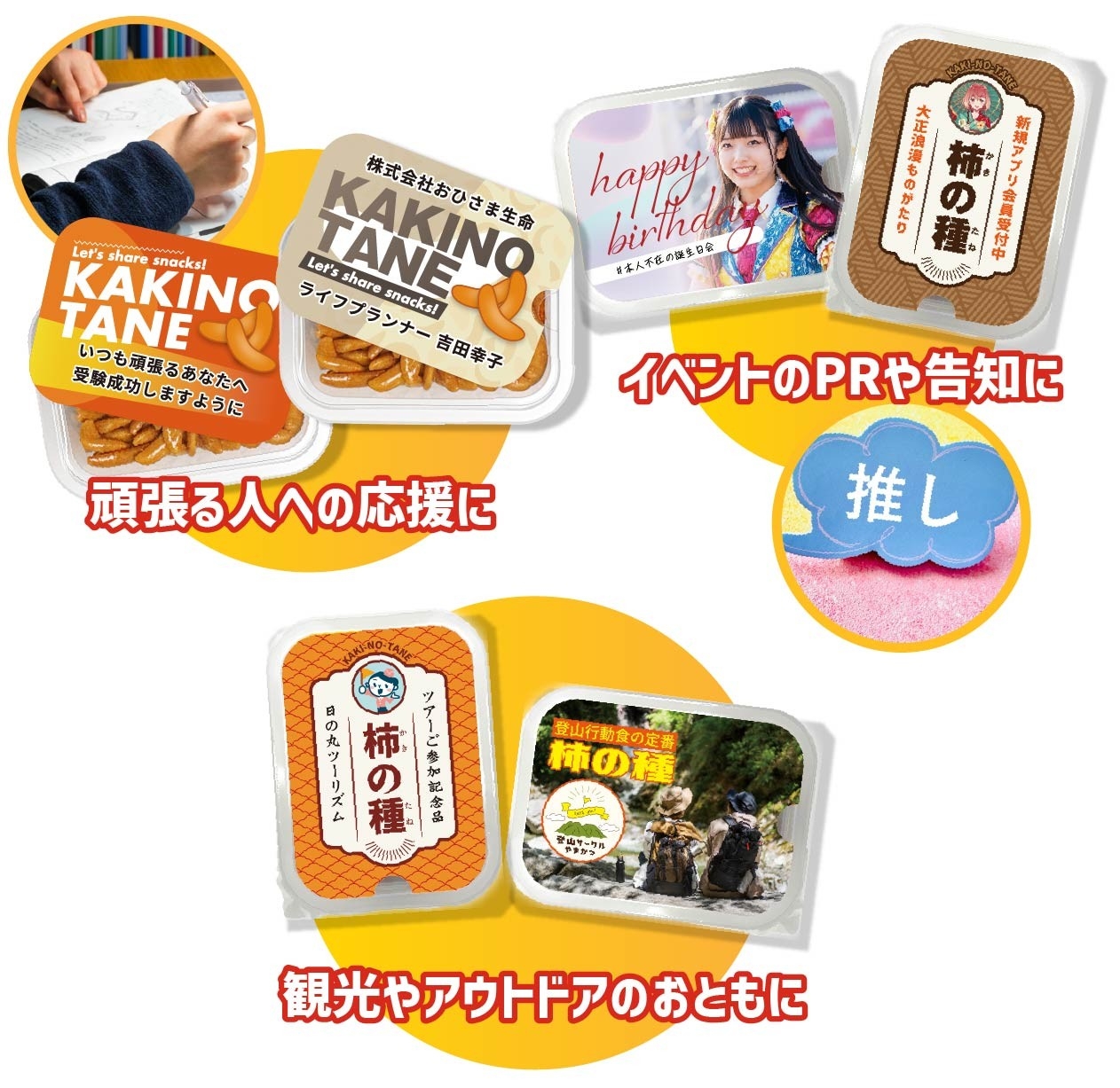 本商品は、人気のスナック「柿の種」をカップに詰め、台紙部分を自由にデザインできるオリジナルパッケージ仕様。ピーナッツは含まれておらず、幅広い年齢層に配りやすい仕様です。企業のプロモーションや、学校・イベントでの配布用ノベルティに最適です。