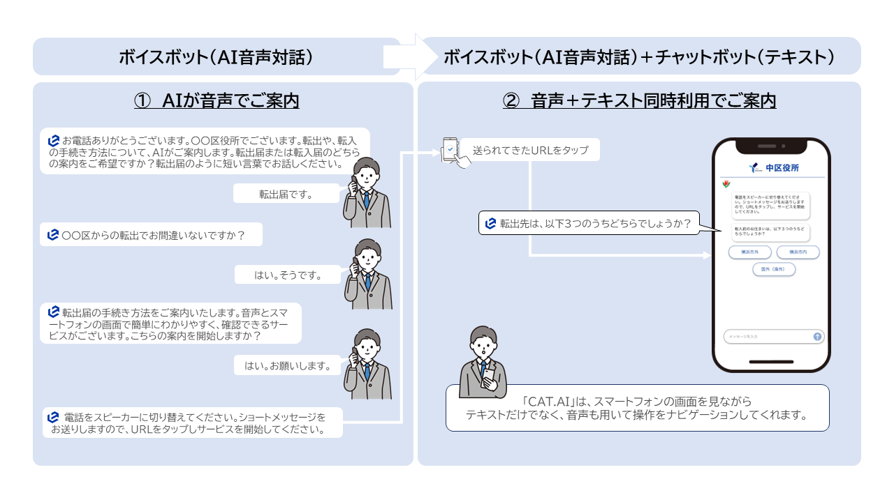「CAT.AI」は、ボイスボットとチャットボットをオールインワンで提供する、最新の「ナビゲーション型対話AIサービス」です。音声(ボイスボット)とテキスト(チャットボット)を駆使し(*1)、利用者が抱える課題に対しスムーズに、ストレスフリーなユーザー体験を提供します。独自開発のNLP(自然言語処理)技術を搭載し、AIであってもヒトと話すような自然なコミュニケーションを実現できることが特徴です。CAT.AIのAI対応完了率9割を越える高さ(*2)、直感的でわかりやすいUI、利用者へのナビゲーションシナリオデザイン力の高さから本年度は複数の自治体と本番導入を見据えた実証実験を実施しています。