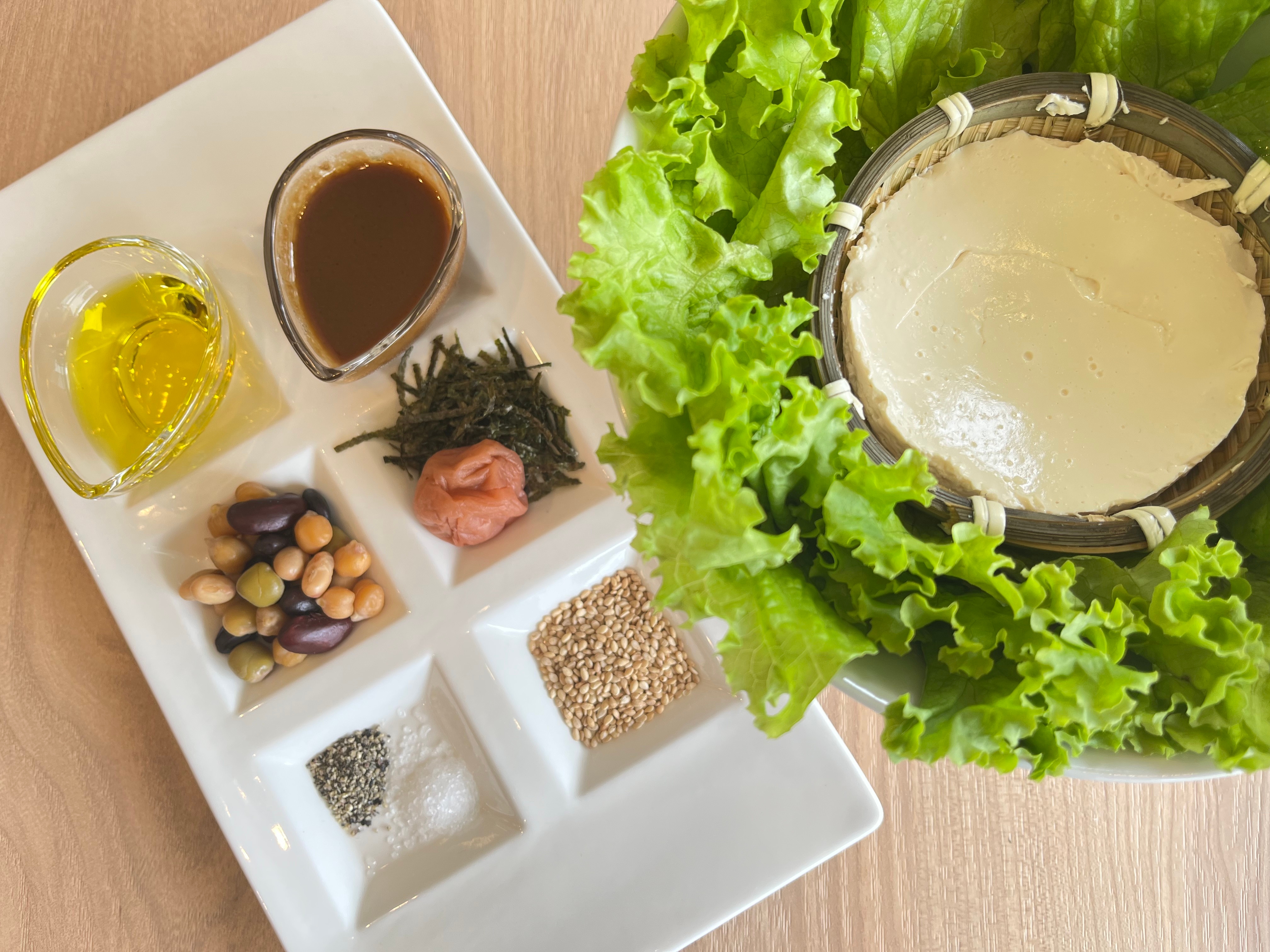 さまざまな薬味を楽しんでいただき、まずは豆腐だけを楽しんでもらうのも、サラダに混ぜて胡麻ドレッシングで召し上がっていただくのもお勧めです。