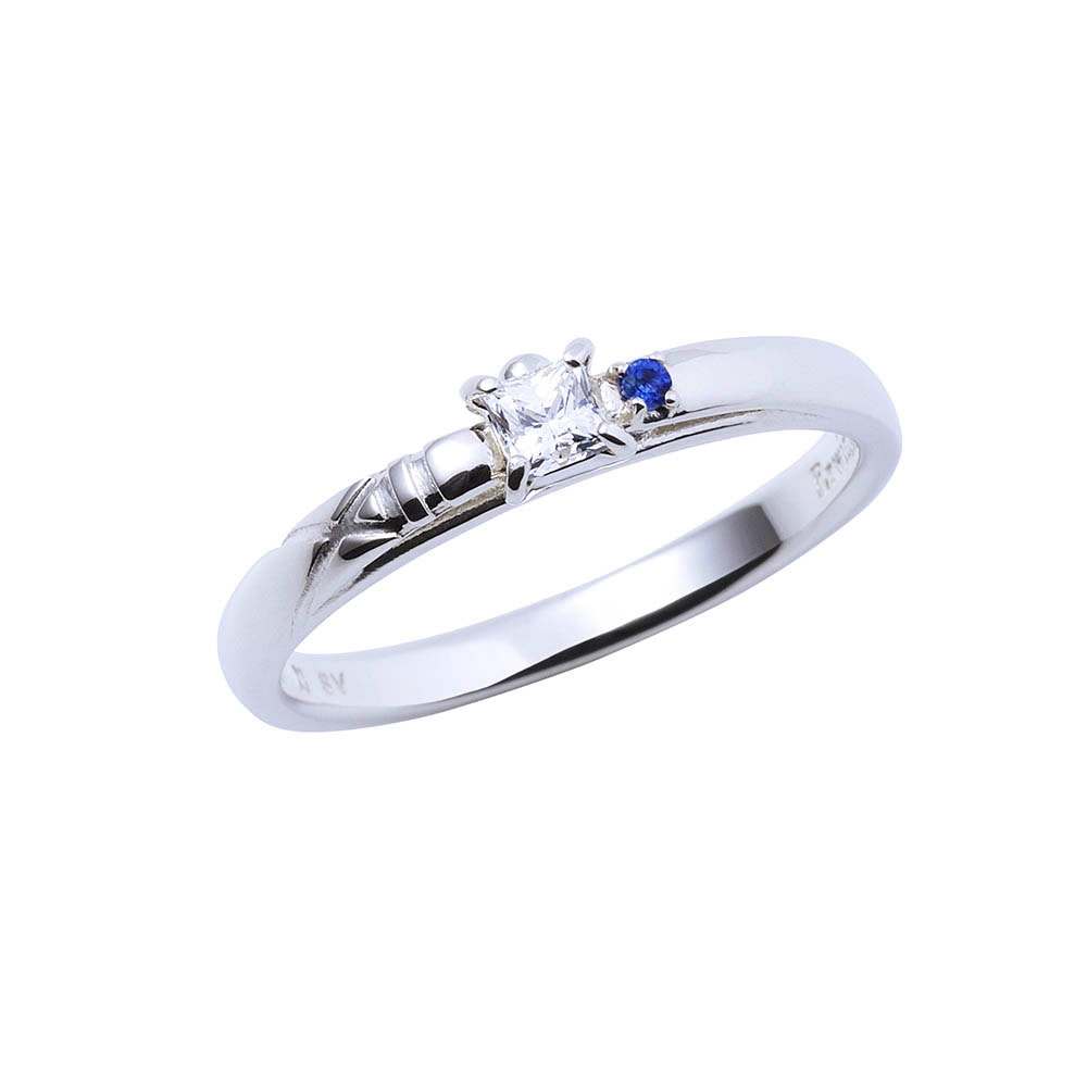 甲丸フォルムのリングにコスチュームの固定ベルトのラインを取り込み、煌びやかなスクエアカットのストーンとサファイヤをセット。