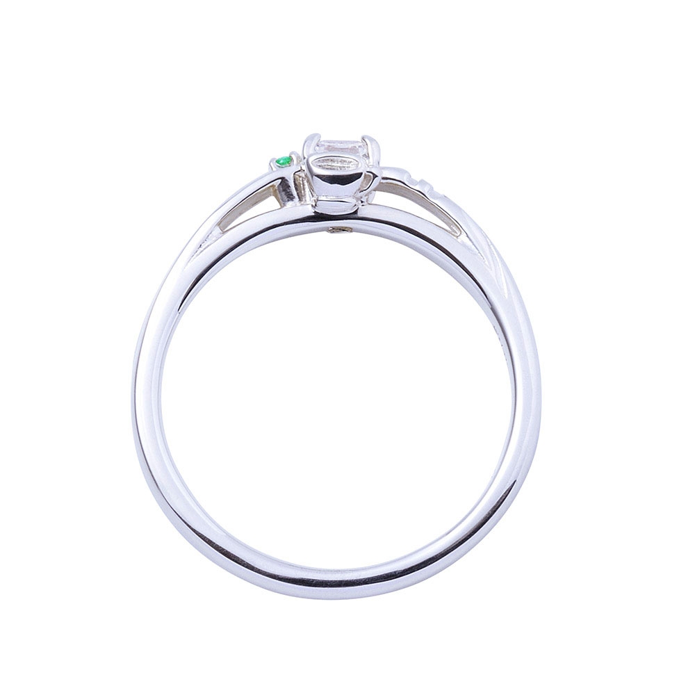 甲丸フォルムのリングにコスチュームの固定ベルトのラインを取り込み、煌びやかなスクエアカットのストーンとエメラルドをセット。