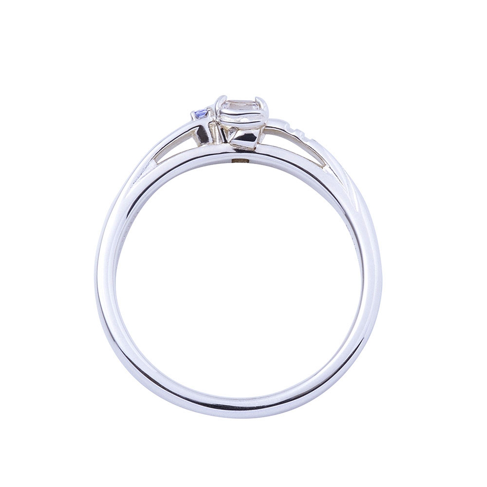 甲丸フォルムのリングにコスチュームの固定ベルトのラインを取り込み、煌びやかなスクエアカットのストーンとタンザナイトをセット。