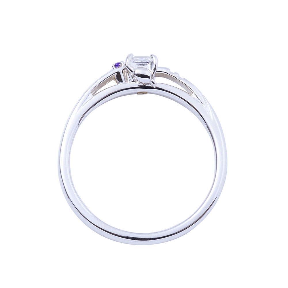 甲丸フォルムのリングにコスチュームの固定ベルトのラインを取り込み、煌びやかなスクエアカットのストーンとアメジストをセット。