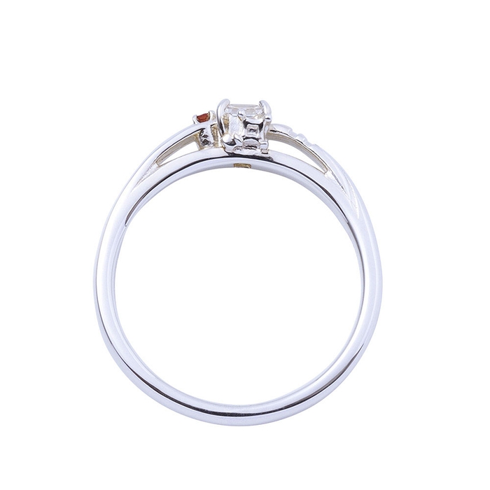 甲丸フォルムのリングにコスチュームの固定ベルトのラインを取り込み、煌びやかなスクエアカットのストーンとガーネットをセット。