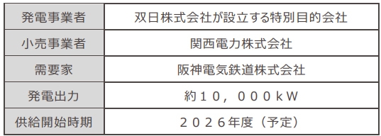この取組みは、双日が設立する発電事業者が当社専用の太陽光発電設備を開発・運営し、関電が小売事業者として当社への電力の調達・供給を行うもので、供給開始は2026年度を予定しています。