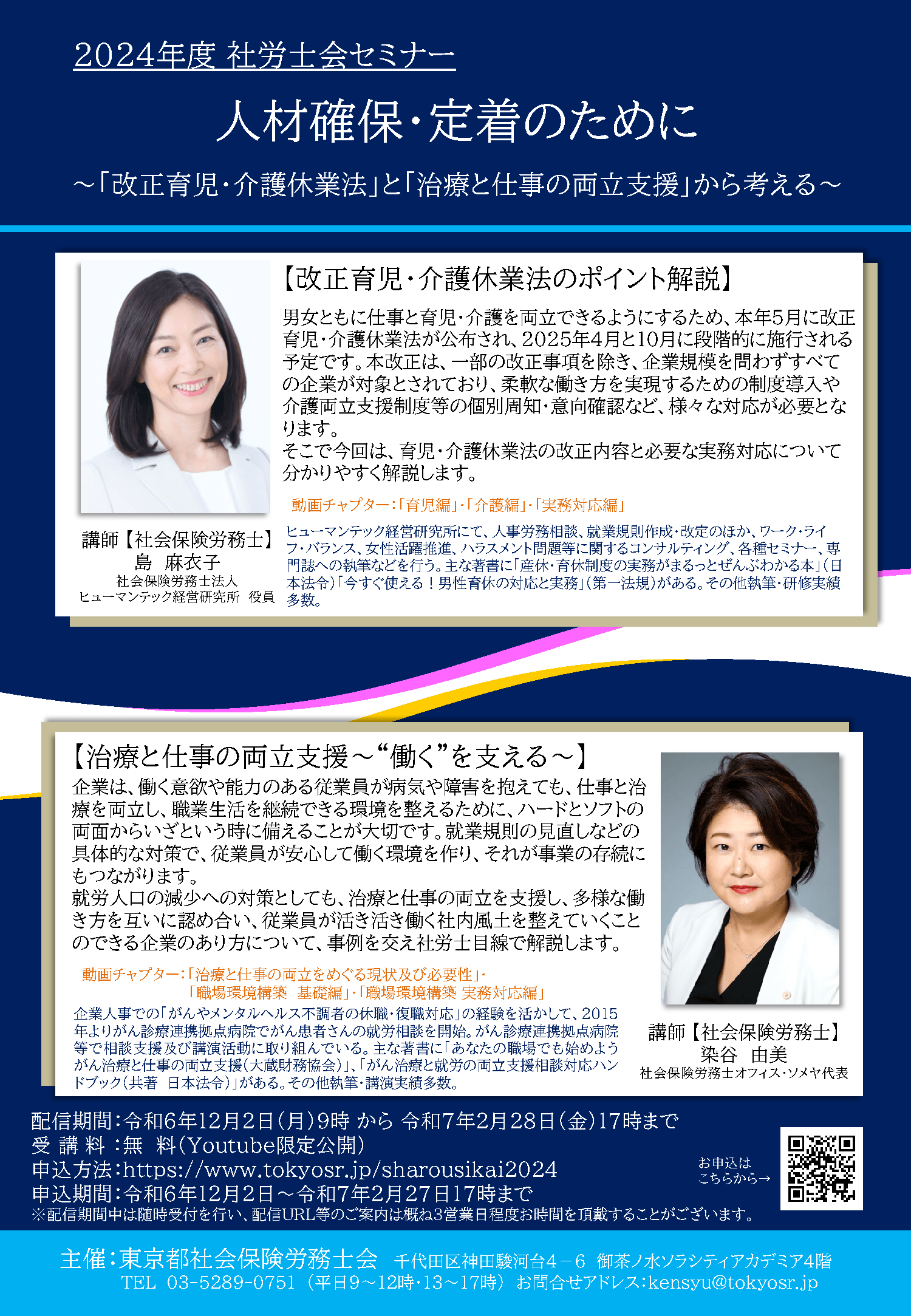 また、治療と仕事の両立を支援し、多様な働き方を互いに認め合い、従業員が活き活き働く社内風土を整えていくことのできる企業のあり方について、就労人口の減少への対策とともに、事例を交え社労士が実務家の目線で解説します。