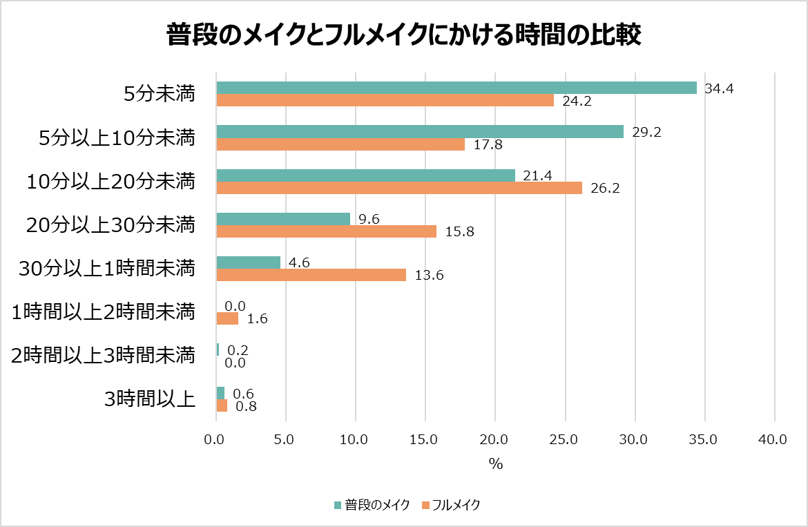 メイクについて、日々仕事に行くときなど日常的にしている「普段のメイク」と、最も時間と手間をかけて行う「フルメイク」で、それぞれどれくらい時間をかけているか聞きました。普段のメイクは「5分未満(34.4%)」、フルメイクにかける時間は「10分以上20分未満(26.2%)」という人がそれぞれ最も多い結果に。仕事に向かう平日の朝など、時間がない日はメイクを簡単に済ませたい、という人は多いと考えられます。ほとんどの回答が1時間未満に集まりましたが、普段のメイクでも「3時間以上(0.6%)」かけている人もいました。
