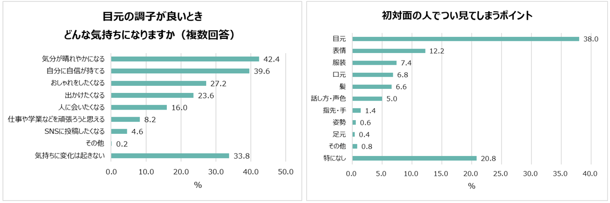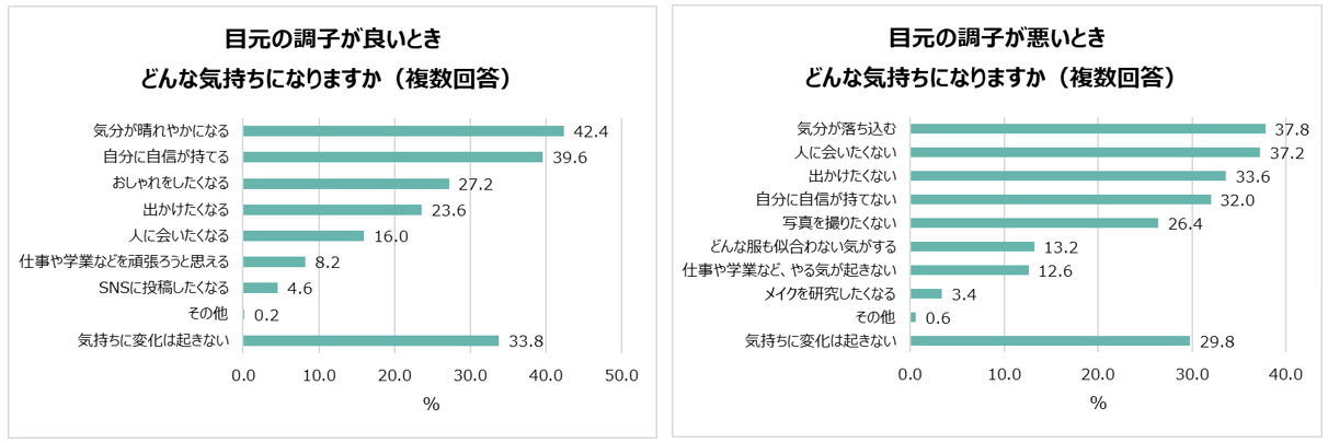 まず、目元の調子が良いときと悪いときで、気持ちや行動に変化があるか調査しました。その結果、目元の調子によって約7割の人が気持ちに変化が起きることが判明。目元の調子が良いときは「気分が晴れやかになる(42.4%)」「自分に自信が持てる(39.6%)」「おしゃれをしたくなる(27.2%)」など、前向きな気持ちになりやすいと分かりました。一方、調子が悪いときは約4割の人が「気分が落ち込む(37.8%)」「人に会いたくない(37.2%)」と回答しました。