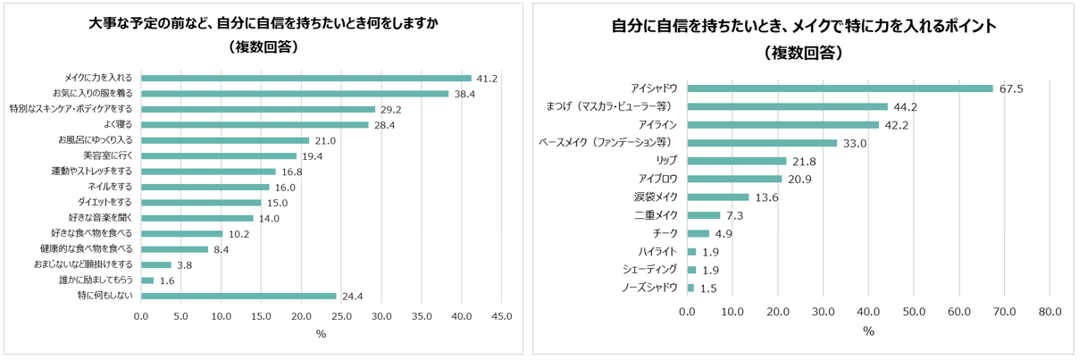 デートや大きな仕事といった大事な予定の前など、自分に自信を持ちたいときに何をするかも聞いたところ、「メイクに力を入れる(41.2%)」「お気に入りの服を着る(38.4%)」と、約4割が回答。目元を含め、見た目が変化すると気持ちも変わる女性は多いと考えられます。最も多くの回答を集めた「メイク」について、特に力を入れるポイントは「アイシャドウ(67.5%)」「まつげ(マスカラ・ビューラー等)(44.2%)」「アイライン(42.2%)」と、アイメイクが上位に。女性たちにとって、目元の重要度の高さがうかがえます。
