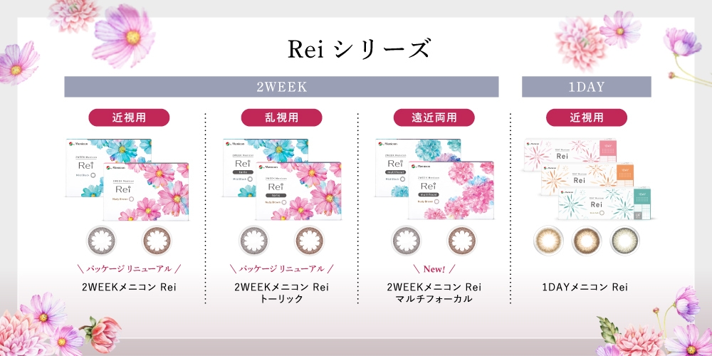 メニコンの『Rei』シリーズは、瞳を自然に大きく見せるカラーコンタクトレンズです。2WEEKタイプ(近視用・乱視用)、1DAYタイプ(近視用)と幅広くご用意しており、この度、『2WEEKメニコン Rei』のパッケージがリニューアル。さらに遠近両用タイプが新発売となります。毎日のおしゃれや、気分を上げたいときのアイテムとして取り入れてみてはいかがでしょうか。
