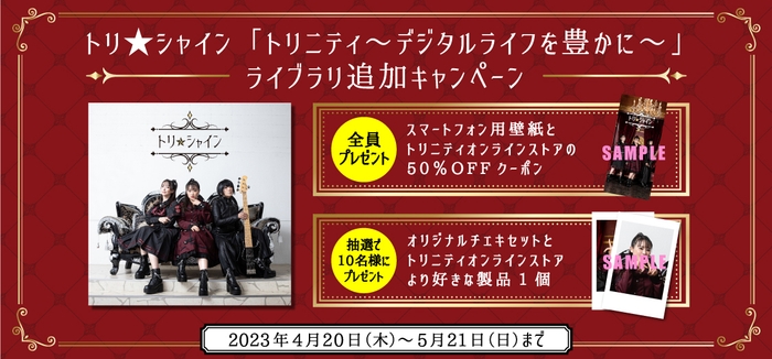 さらに抽選で10名様に、トリ☆シャインのオリジナルチェキセットと、トリニティオンラインストアより好きな製品1個もプレゼント。