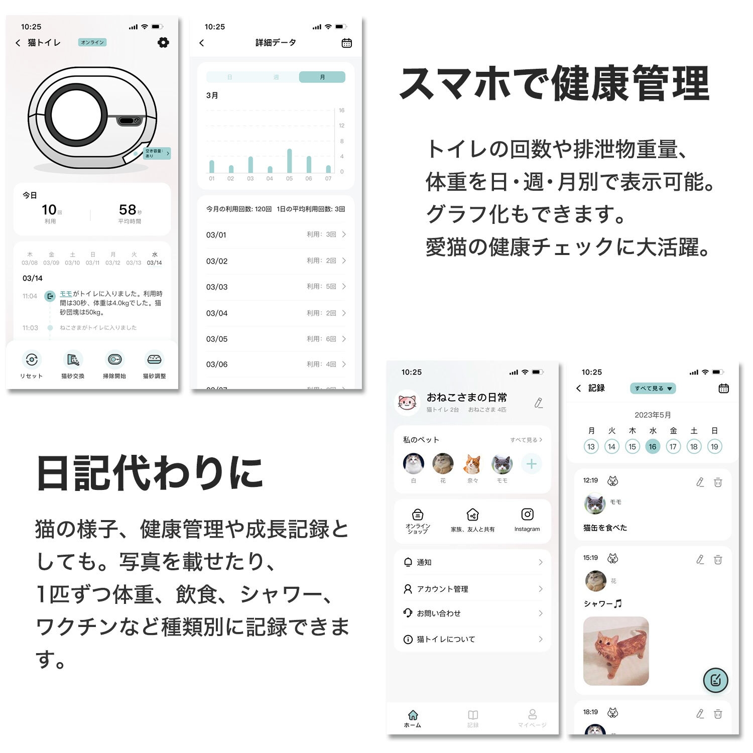 まるで日記をつけるように直感的に記録ができ、猫の変化に気が付けるペットテック時代の健康管理機能が満載。