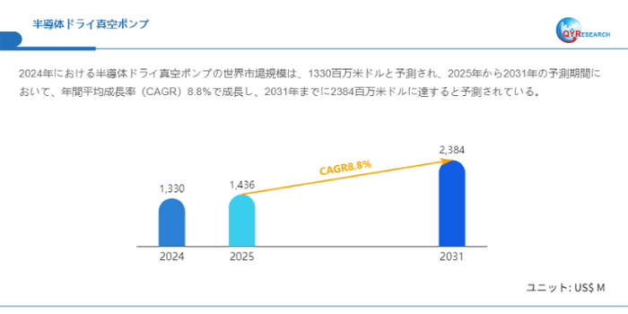 QYResearchが発表した新たな市場調査レポート「半導体ドライ真空ポンプ―グローバル市場シェアとランキング、全体の売上と需要予測、2025~2031」によると、世界の半導体ドライ真空ポンプ市場規模は2024年の約1330百万米ドルから2025年の1436百万米ドルへと順調に拡大すると見込まれ、予測期間中は年平均成長率(CAGR)8.8%で成長し、2031年には2384百万米ドルに達すると予測されている。