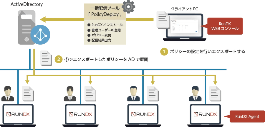 今回、このスタンドアロン運用をメインとする「RunDX DeviceControl」に対して、複数台で導入/運用を希望されるお客様からのご要望にお応えすべくポリシーの一括配信ツール「PolicyDeploy」を無償でご提供します。