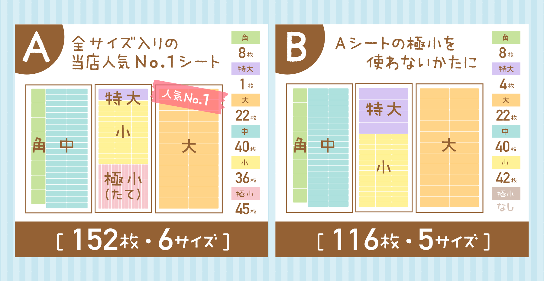 その中で、お名前シールは“一番人気のAシート”をセット商品としておりましたが『シートを好きに選べるようにして欲しい。』というお声を多数いただくようになったため、用途によって選べる5シートからお選びいただけるようにリニューアルをいたしました。