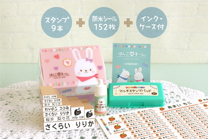 お名前スタンプ+イラストスタンプの9本と、マルチスタンプパッド、インク溶解液、収納ケース、防水タイプのお名前シールの13点がセットになりました。お名前スタンプは、ひらがな・漢字の組み合わせで長く使え、当店人気No.1の防水お名前シールは大小バリエーション豊かな152枚入りです。