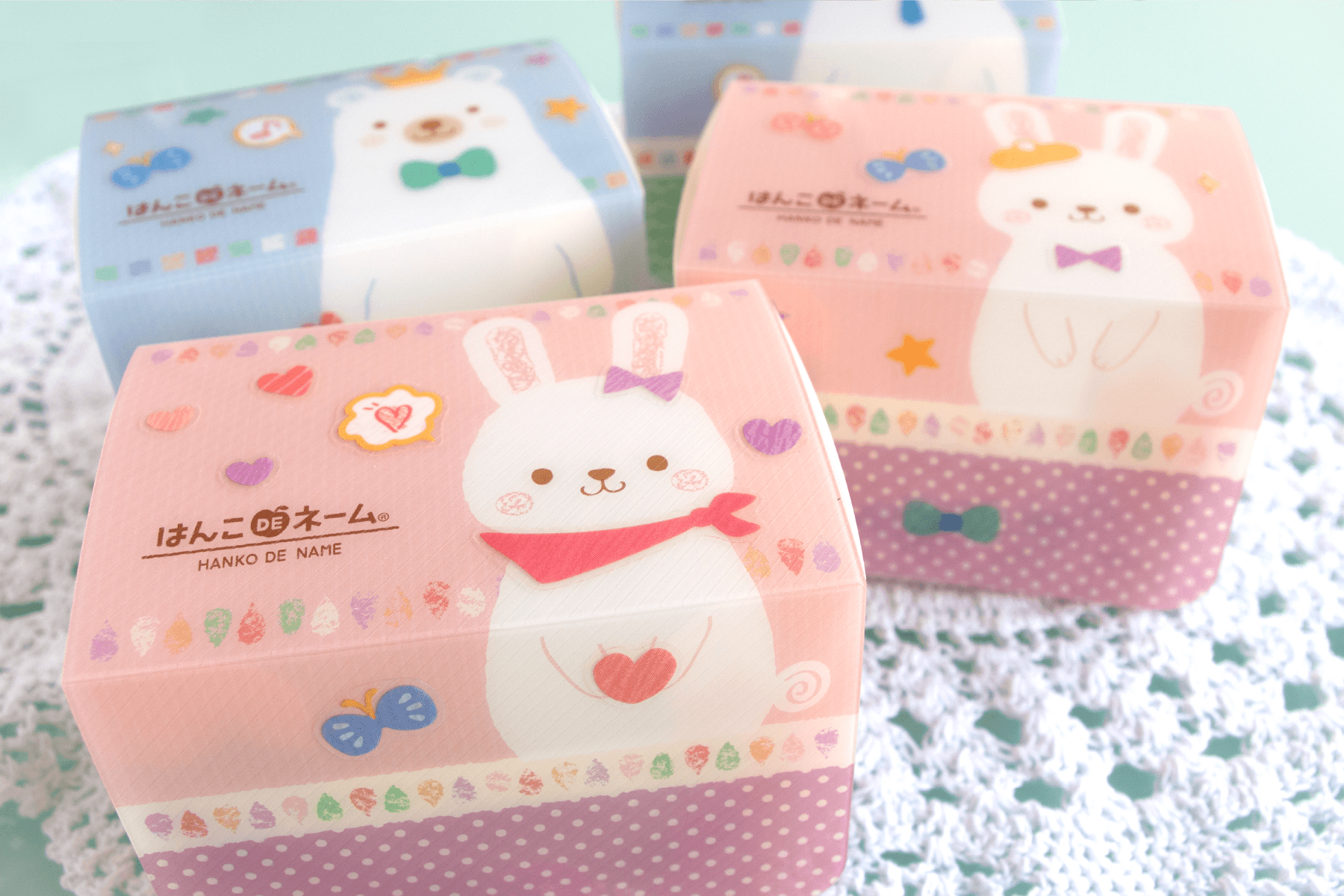 お名前スタンプを立てて収納できるオリジナルケースの絵柄はシロクマとウサギいずれかからお好みでチョイスできます。