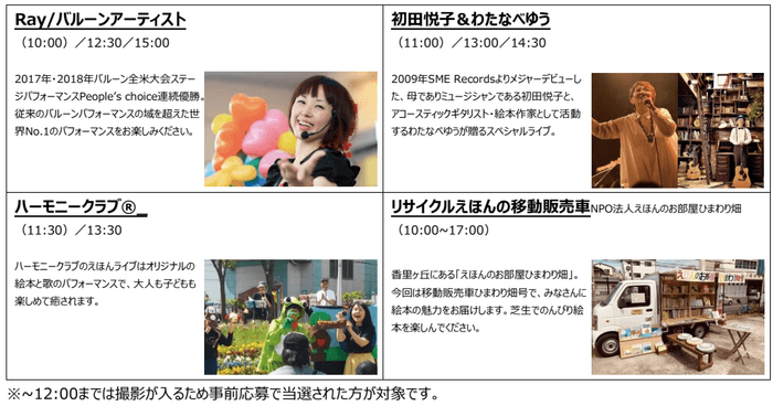 ※9:30~12:00頃までは事前応募にて当選された方のみ参加の広場撮影会を行います。撮影は番組取材や各種SNS、広報活動に使用する撮影会となりますので、予めご了承ください。