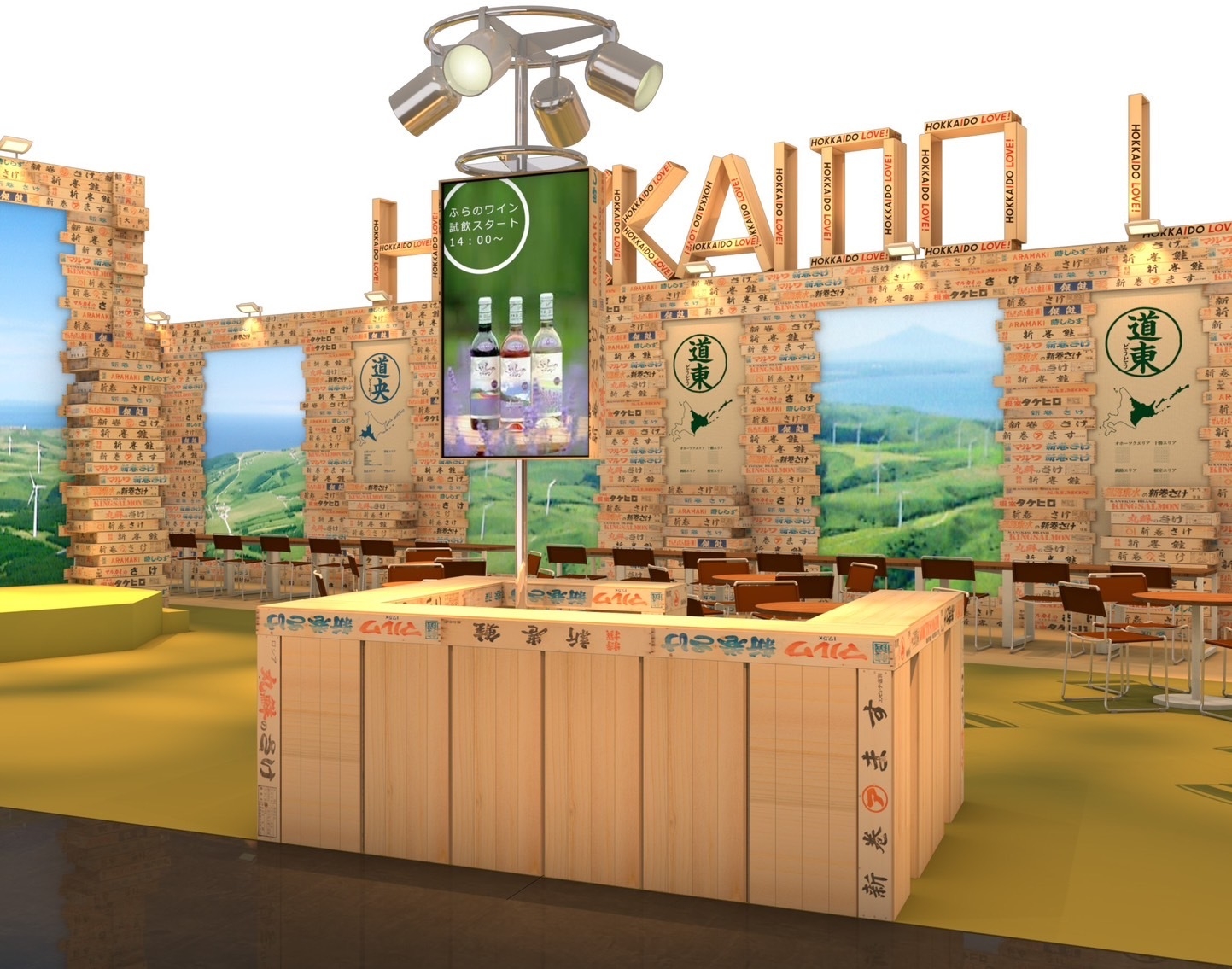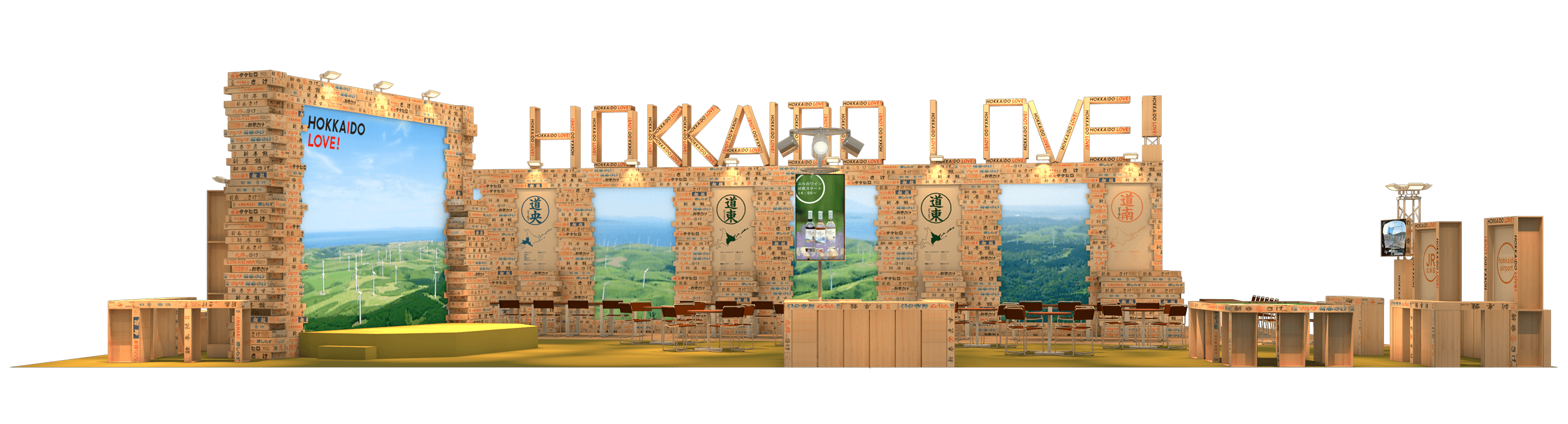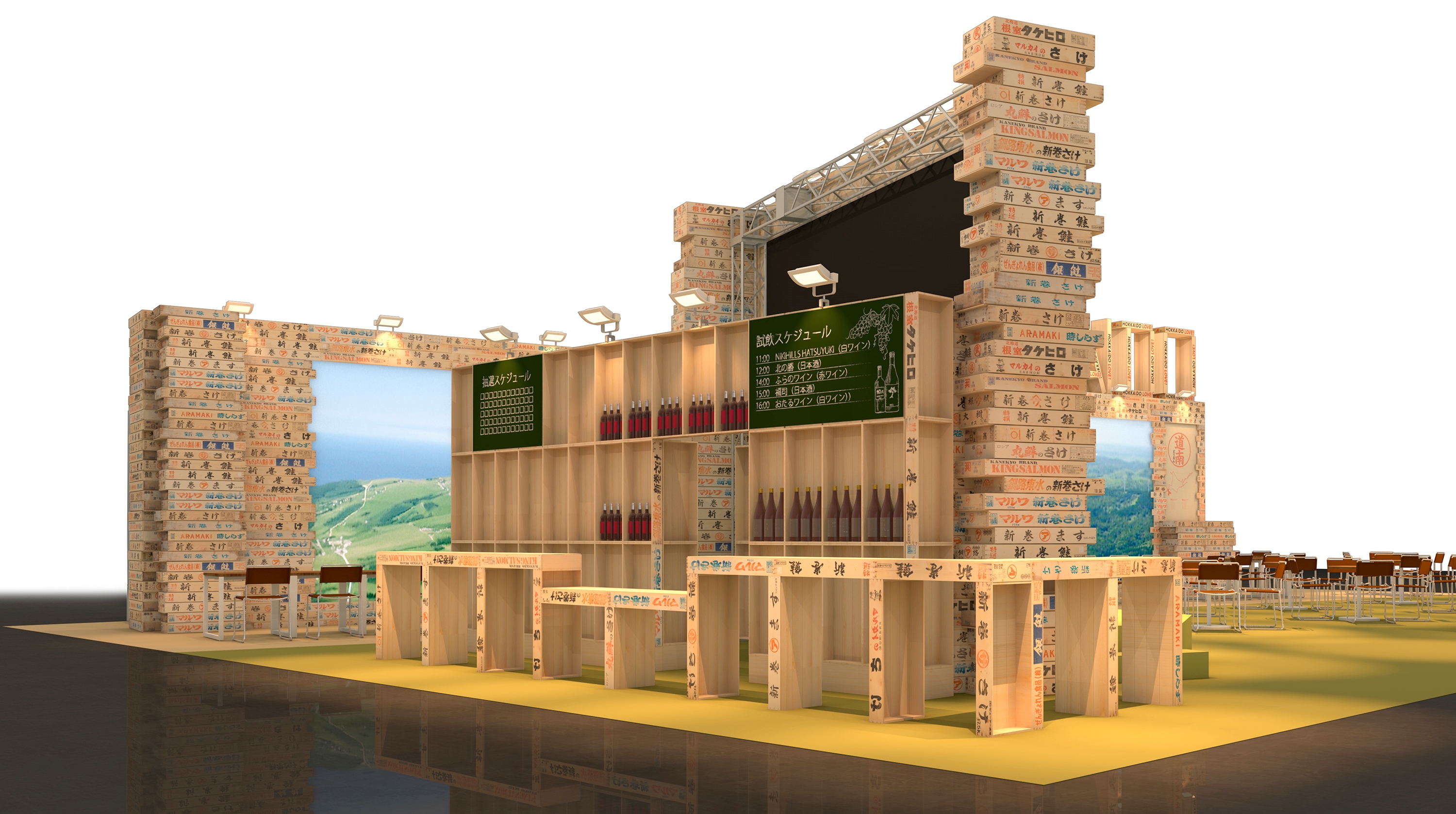 そのために、情報量が多くイメージを伝えやすい大型ビジョンを複数基設置し、動画コンテンツで来場者に魅力を伝えます。そして、そこに北海道らしさを感じられる鮭箱を装飾することで、異質と異質の組み合わせで生まれるインパクトのある、思わず誰かに伝えたくなるブースを作りたいと考え、このデザインを制作いたしました。圧倒的なスケールとなるブースで、従来の北海道の魅力に加え、近年新しく誕生したコンテンツも紹介し、アップデートされた北海道を圧倒的に表現します。