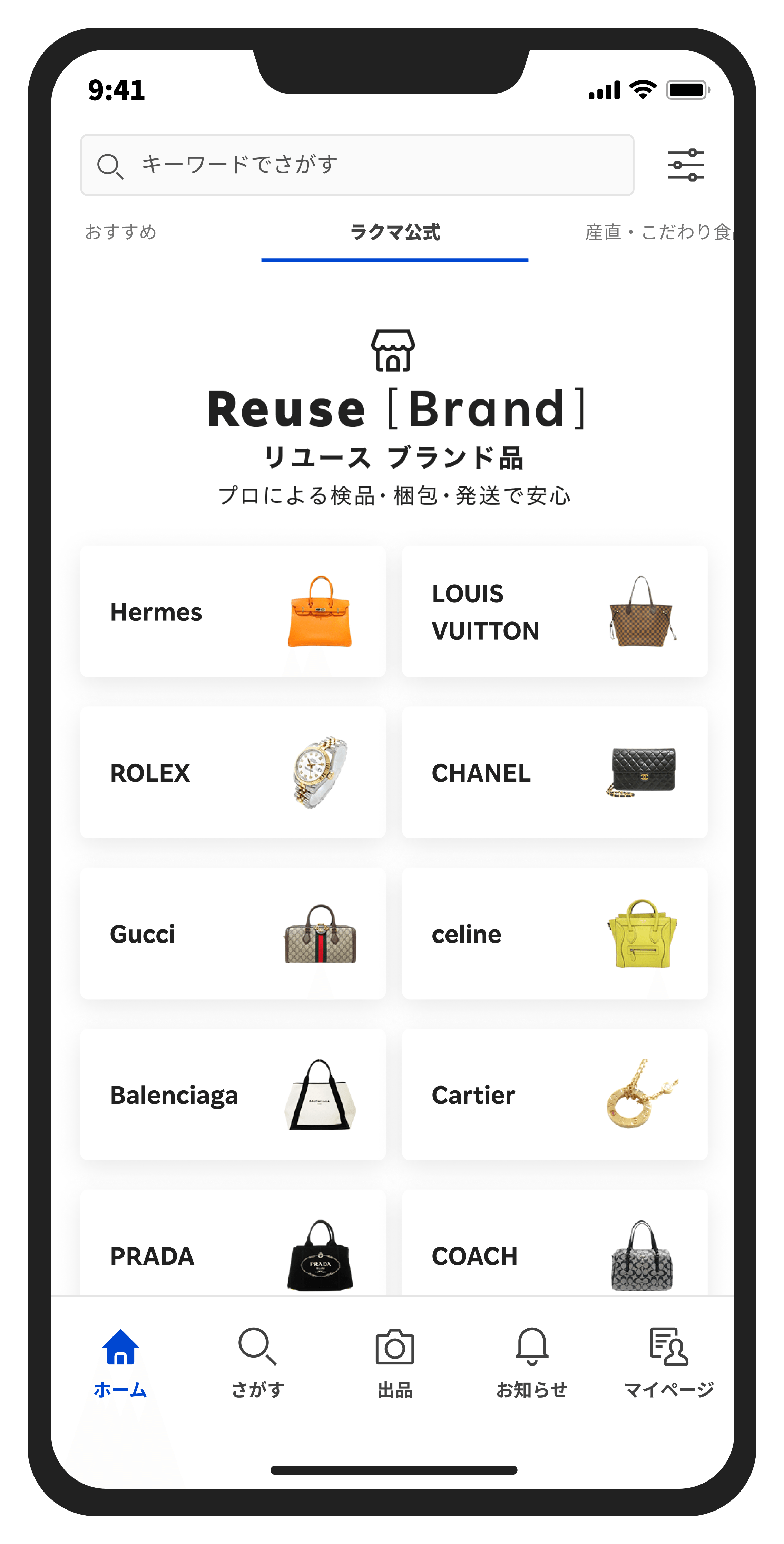 「ラクマ公式ショップ」では、出品ページに「公式マーク」が表示され、個人の出品者と事業者を見分けることができ、従来の個人間取引と同様に、楽天会員であればどなたでもご利用いただけます。