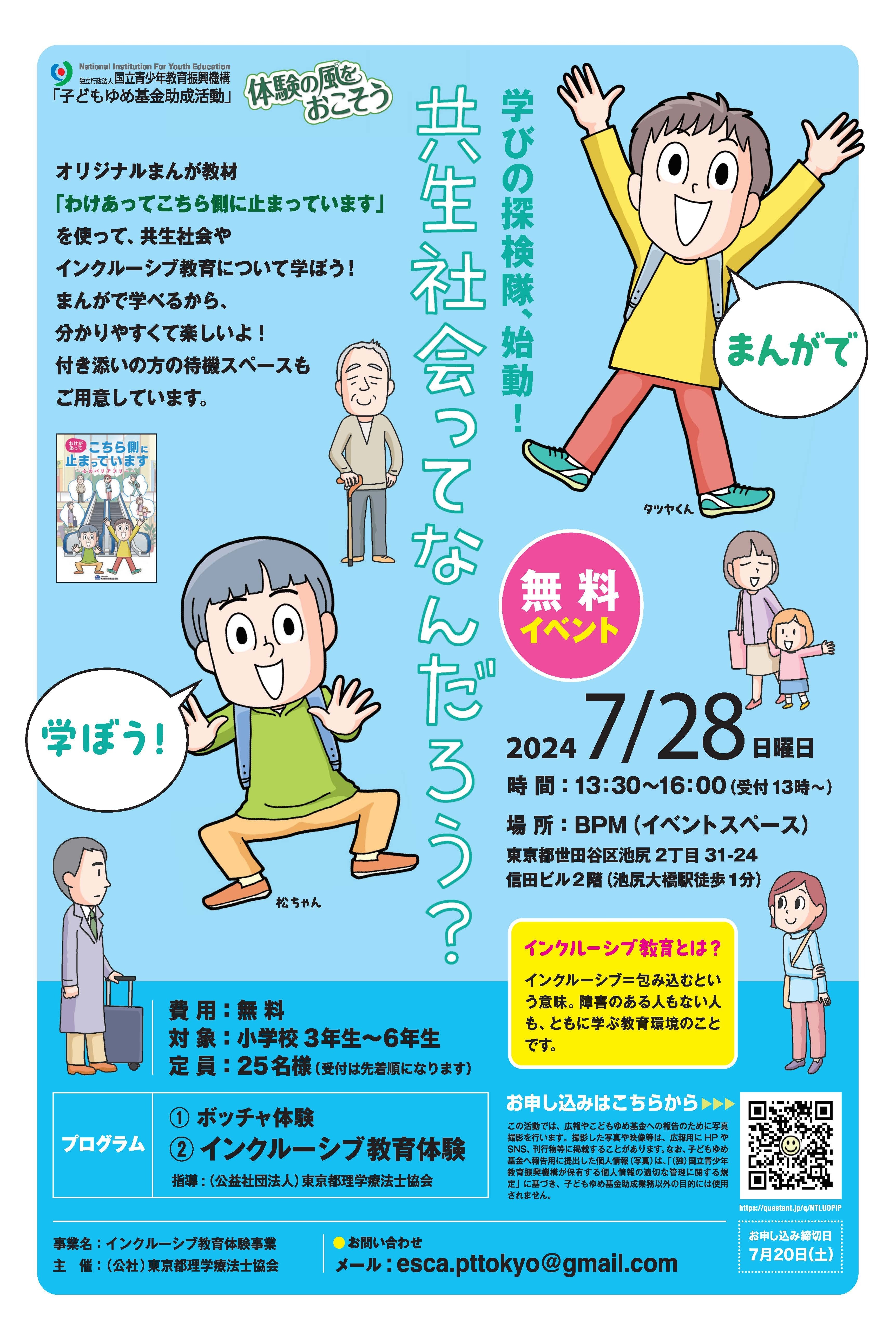 公益社団法人東京都理学療法士協会(会長:森島 健)は、昨年度に引き続き、2024年7月28日(日)に、小学生を対象としたインクルーシブ教育体験事業「共生社会ってなんだろう?」を池尻大橋駅徒歩1分のBPMにて開催します。開催に先立ち、小学3年生~6年生の児童生徒の参加申し込みを、2024年7月20日(土)まで以下申し込みリンクより募集します。