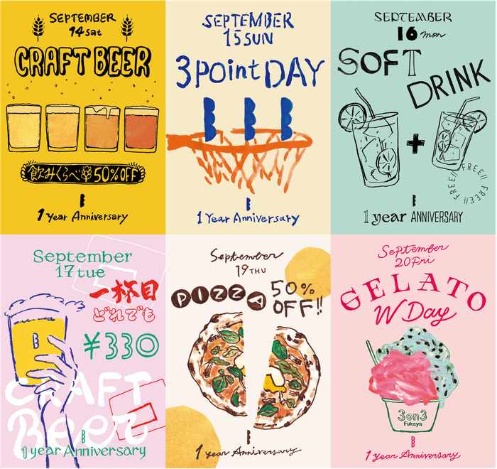 これを記念して、2024年9月14日(土)から9月20日(金)まで1周年記念ウイーク日替わり特典キャンペーンを行います。そして、9月21日(土)には記念イベント「Half Court Festival~1st Anniversary~」を開催。9月14日(土)から21日(土)のイベントまで毎日(定休日を除く)ご来店いただいたお客様には、サンクスプレゼントを進呈いたします。皆様お誘い合わせのうえ、ぜひお越しください。