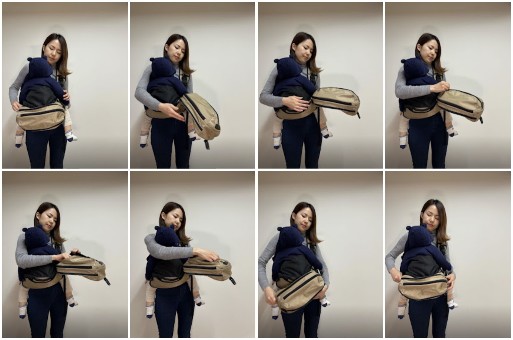 子供を鞄に乗せると本体は、下を向いてしまい、子供に隠れて鞄が見えなく、開閉の際に使用するファスナーを探すのも大変です。また、中身が見えなかったり、荷物を取り出す際に落としたり、大変不便ですが、この商品は、本体が稼働し、荷物を容易に取り出す事ができます。また、2025年4月13日、大阪・関西万博の開幕日に、私が4歳の息子とブルーインパルスの飛行ショーを夢洲で観覧する予定でした。しかし、あいにくの雨天でイベントは中止に。帰路では駅が大混雑し、1時間以上身動きが取れない状況に。その際、疲れた息子に抱っこをせがまれ、偶然持っていた自社製品の「抱っこ楽ちんバッグ」が大いに役立ちました。