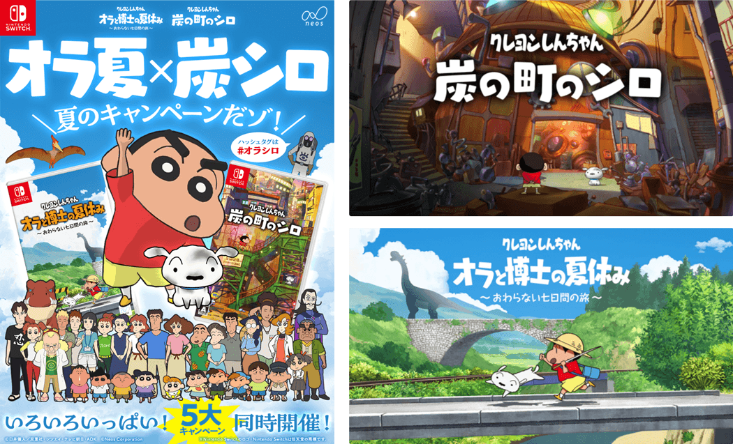 テクミラホールディングスの子会社であるネオス株式会社(本社:東京都千代田区、代表取締役 社長執行役員:池田 昌史)は、日本およびアジア地域で今年発売したNintendo Switch向けソフト【クレヨンしんちゃん 『炭の町のシロ』】(以下、炭シロ)と、発売から3周年を迎える全世界累計50万本超のヒット作【クレヨンしんちゃん『オラと博士の夏休み』〜おわらない七日間の旅〜】(以下、オラ夏)において、「オラ夏×炭シロ 夏のキャンペーンだゾ!」(以下、本キャンペーン)を開催いたします。