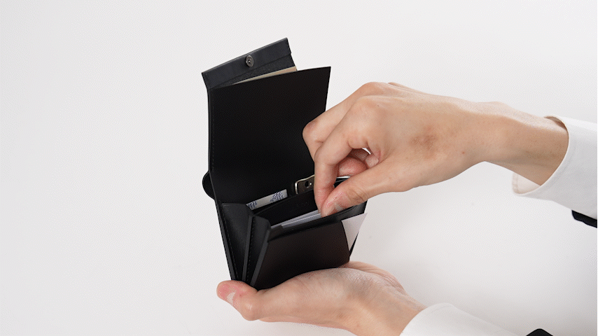 名刺入れと財布が完全に独立した収納部を持つことで、名刺の型崩れを防ぎながら、スマートな名刺交換を可能にしました。もう、名刺入れと財布を別々に持ち歩く必要はありません。