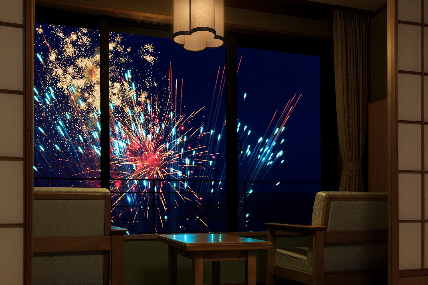 ホテル前から打上げを行う「銀水花火」は、夕食後のひとときにゆっくりくつろぎながら、館内から花火をお楽しみいただけます。