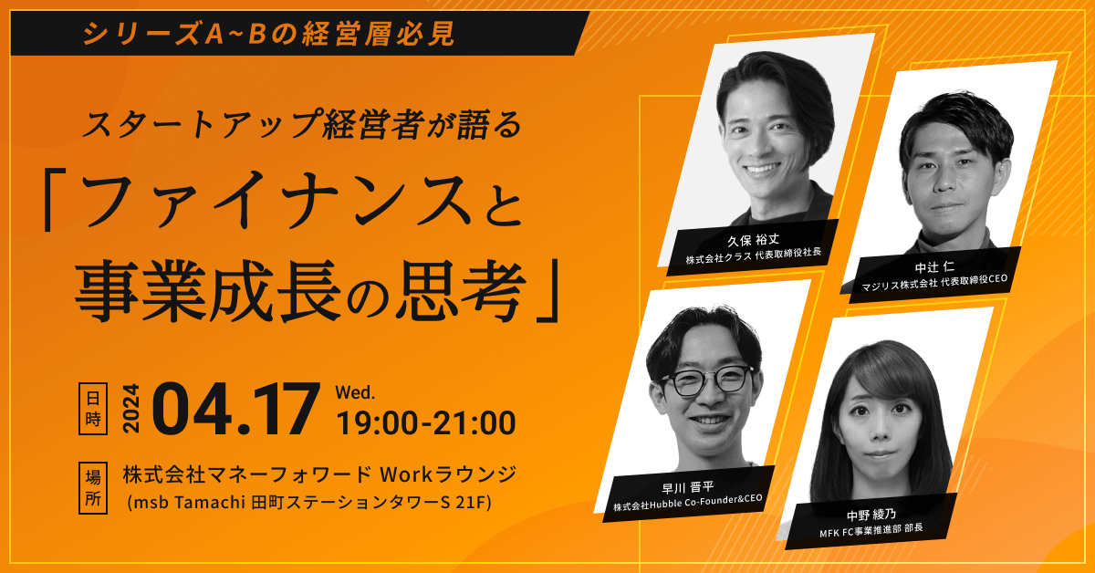 マネーフォワードケッサイ株式会社は、2024年4月17日(水)19:00より株式会社マネーフォワードのワークラウンジにてスタートアップ向けの無料セミナー「スタートアップ経営者が語る『ファイナンスと事業成長の思考』」を開催します。本セミナーでは、株式会社クラス・株式会社Hubble・マジリス株式会社から登壇者をお迎えし、財務戦略や人事設計といった「成長スタートアップ経営者の思考」について対談を行います。