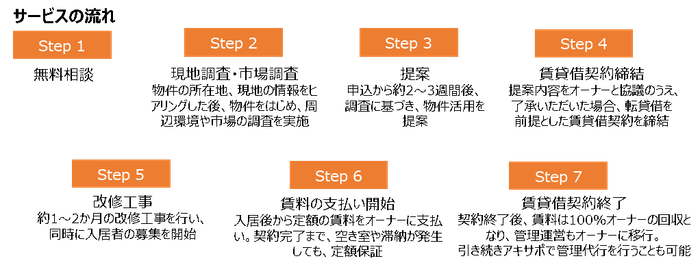 一定期間転借するサービスです。街の資源である空き家の再生を通じて地域コミュニティの活性化に貢献しています。