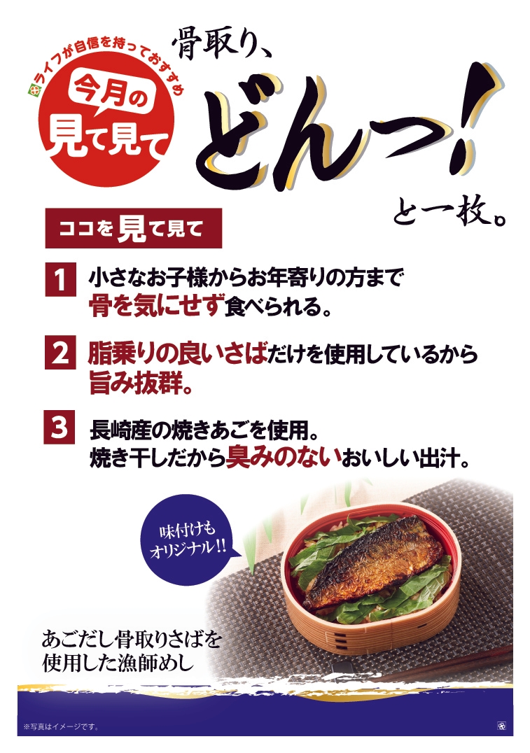 “おいしい” “ワクワク” “ハッピー” をお届けするライフコーポレーションは、「あごだし骨取りさばを使用した漁師めし」を、9月1日に新発売いたしました。