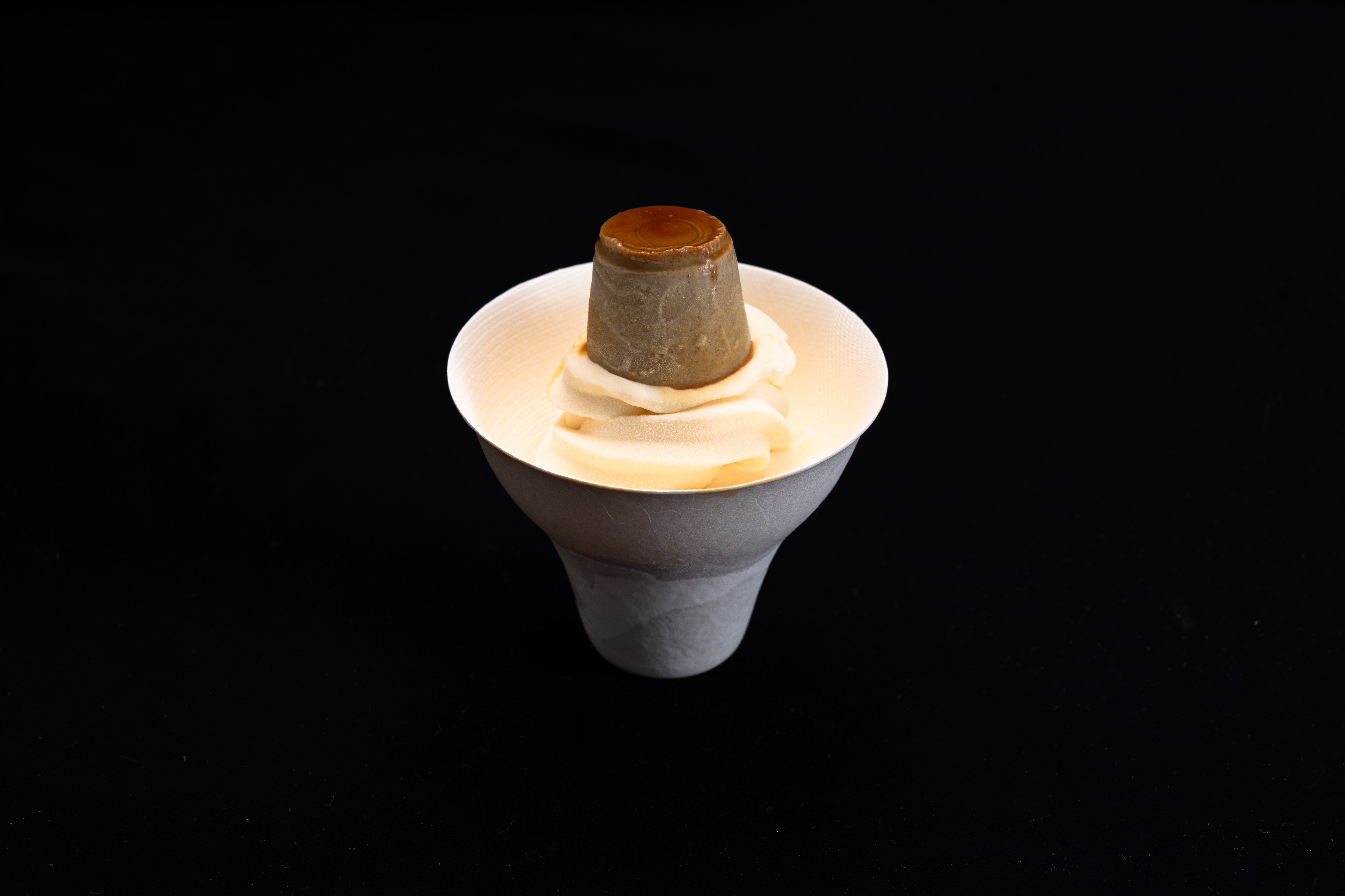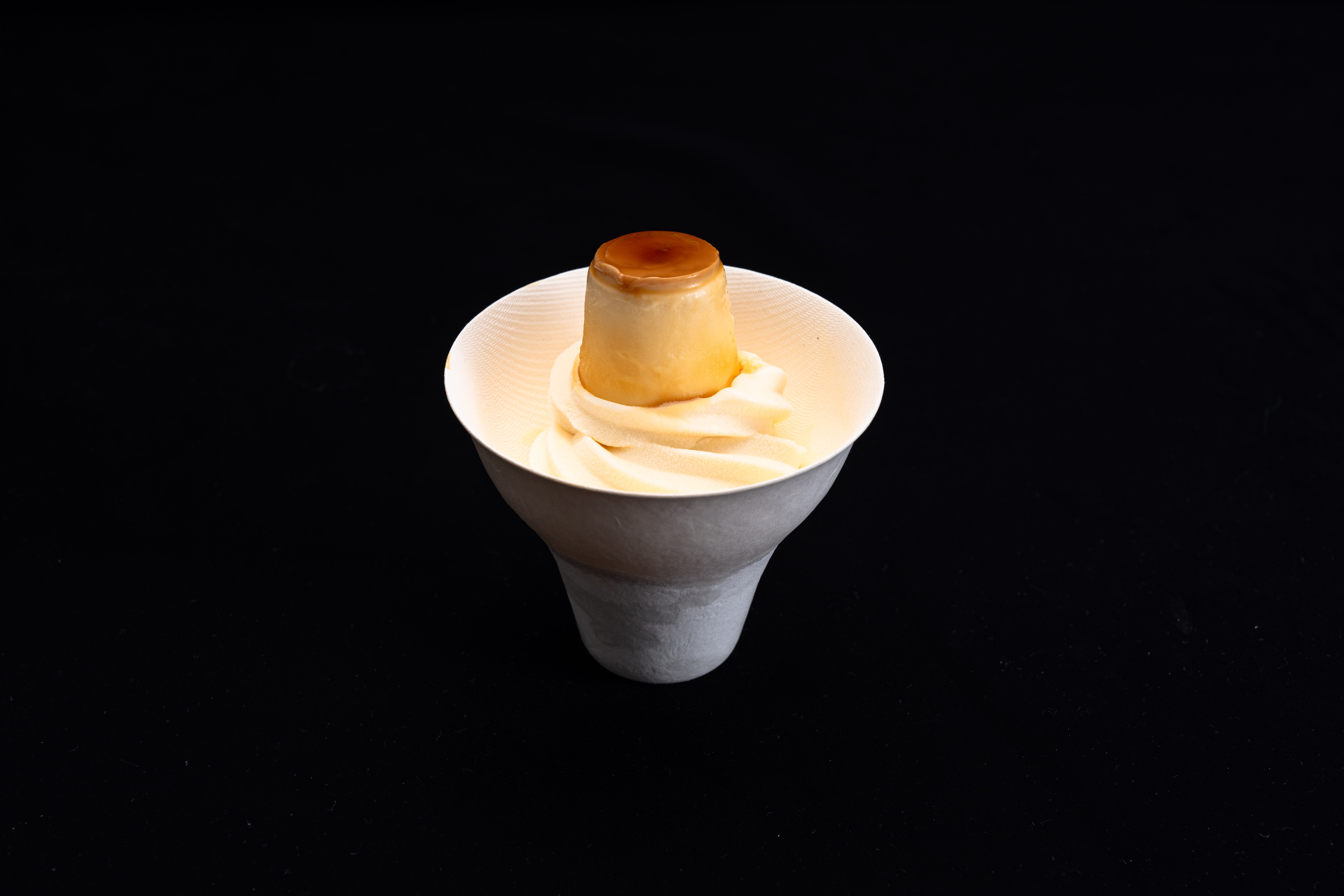 ●-8℃でプリンそのものを凍らせたソフトクリーム状のプリンの上にミニプリンをトッピング