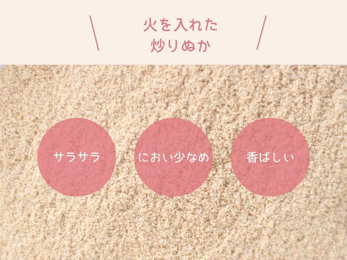 米ぬかを焙煎することで独特な香りを抑え、香ばしくサラサラとした状態に仕上げました。
