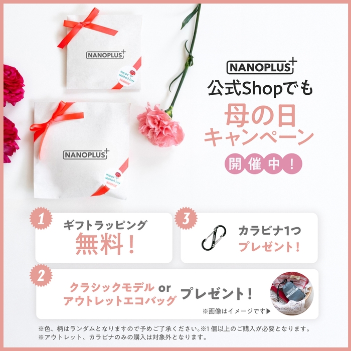 同期間、販売サイトにて商品(一部の商品を除く)を購入された方を対象に、無料で母の日仕様のラッピングがされるキャンペーンを開催します。さらに期間中、商品を購入された方全員に便利なカラビナ及び、クラシックモデルエコバッグもプレゼントいたします。