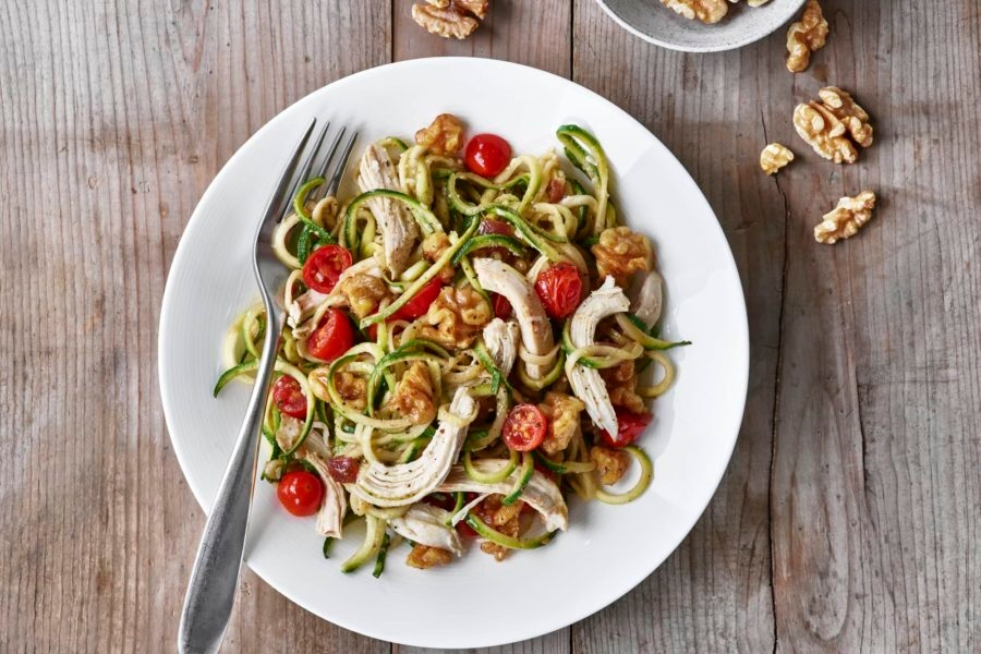 くるみ、チキン、トマトのズッキーニヌードル パルメザン風味