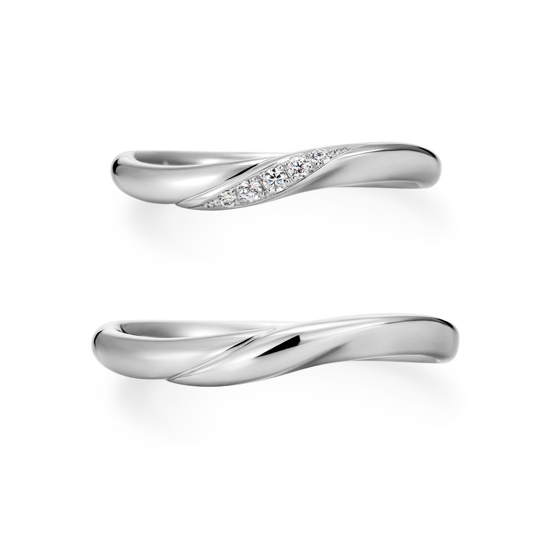 このほどの新作ブライダルリングは、“心地よく流れる時間を、大切なあなたとともに…”をコンセプトに、指のつけ根に馴染むやわらかな曲線美を表現しました。婚約指輪は、センターダイヤモンドに寄り添うように、2石のダイヤモンドをセッティングしています。結婚指輪は、3つの面があるウェーブラインのリングで、プレーン、メレダイヤモンド5ピース、17ピースなど留め方をアレンジできるデザインです。