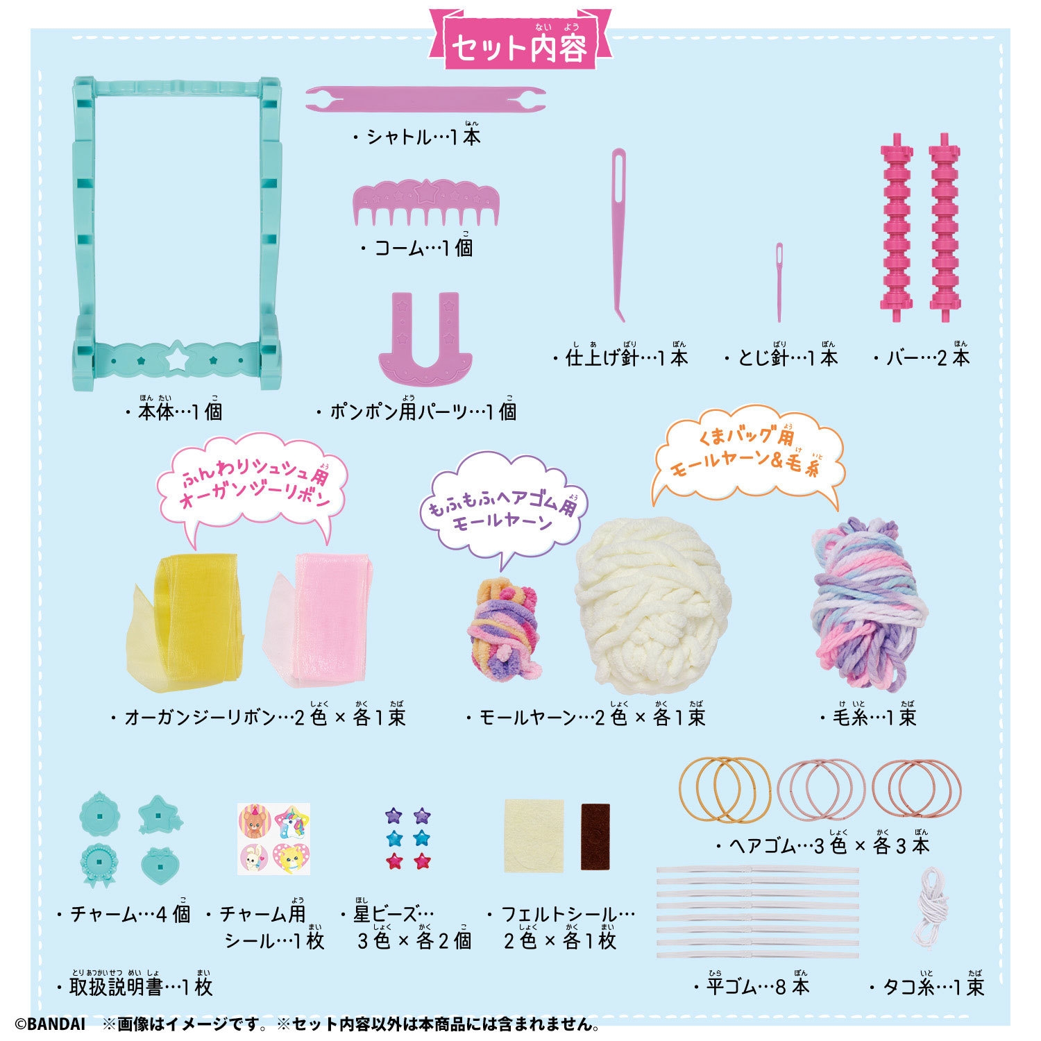 毛糸…1束、チャーム…4個、チャーム用シール…1枚、