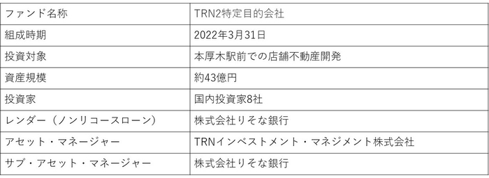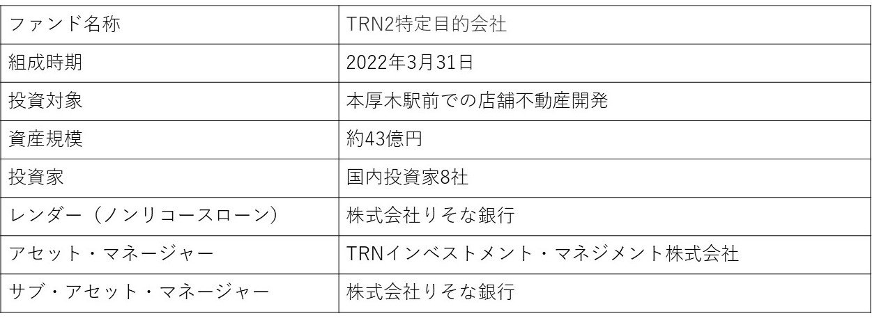 人と街に関わるすべてのことを総合的に支援する店舗流通ネット株式会社(東京都港区:代表取締役社長戸所 岳大)は、100%出資子会社のTRNインベストメント・マネジメント株式会社(以下、 TIM)と株式会社りそな銀行が、共同で開発型(都市型店舗不動産)私募ファンド(以下、本ファンド)を組成することをお知らせいたします。本ファンドは、TIMをアセット・マネージャー、株式会社りそな銀行をサブ・アセット・マネージャーとし、複数の国内投資家から総額約18億円の出資を受け、本厚木駅前の都市型店舗不動産の開発を目的として組成されるものです。